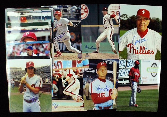 Description:Lot of (50) Philadelphia Phillies signed 8"x10" photographs (EX/MT-NM). Includes Larry Bowa, John Briggs, Doug Clemens with "1966-68 Phillies" inscription, Clay Dalrymple with "60-68 Phils" inscription, Denny Doyle, Scott Eyre, Oscar Gamble, Doug Glanville, Tommy Greene, Greg Gross with "1980 WS Champs" inscription, Tom Herr, Grant Jackson, Mike Lieberthal, Jim Lonborg, Art Mahaffey, Jerry Martin, Roger Mason, Gary Matthews, Len Matuszek, John Mayberry Jr, Bake McBride, Bob Miller, Johnny Podres, Placido Polanco, Ron Reed, Bruce Ruffin, Dick Ruthven, Mac Scarce with "1972-74 Phillies" inscription, Roy Sievers, Heathcliff Slocumb, Roy Smalley, Lonnie Smith, Ron Stone with "1969-72 Phillies" inscription, Tony Taylor, Milt Thompson, Wayne Twitchell, Tom Underwood, Bob Walk, Mitch Williams, Bobby Wine, Mike Zagurski, and others. Signatures rate 8 to 10 out of 10: EX/MT-NM
