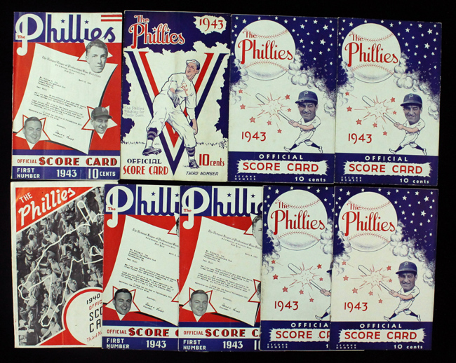 Description:Lot of (9) vintage Philadelphia Phillies programs / scorecards from 1940-1943 (G/VG-EX). Includes 1940 program from game vs Pittsburgh Pirates (VG, unscored); 1943 program from game vs Pirates (VG, scored in pencil, likely spring training game since scorecard doesn't match any regular season games); May 23rd 1943 program from game vs Pirates (VG/EX, scored in pencil); 1943 program from game vs Pirates (VG-VG/EX, unscored); June 17th 1943 program from game vs Boston Braves (G/VG, detached cover, scored in pencil); 1943 program from game vs Brooklyn Dodgers (VG/EX, unscored); 1943 program from game vs New York Giants (VG/EX-EX, partially scored in pencil); 1943 program from game vs Giants (EX, unscored); and 1943 program from game vs Braves (EX, unscored). Range: G/VG-EX