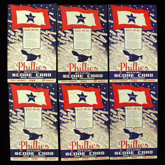 Description:Lot of (6) 1944 Philadelphia Phillies / Blue Jays programs/scorecards (EX-EX/MT). Includes April 30th program from game vs Boston Braves (EX, scored in pencil); May 28th Game 1 program from game vs Pittsburgh Pirates (EX, scored in pencil); May 28th Game 2 program from game vs Pirates (EX, scored in pencil); July 20th program from game vs Pirates (EX/MT, scored in pencil); and (2) July 27th Game 1 programs from game vs St. Louis Cardinals (EX-EX/MT, both scored in pencil). Range: EX-EX/MT