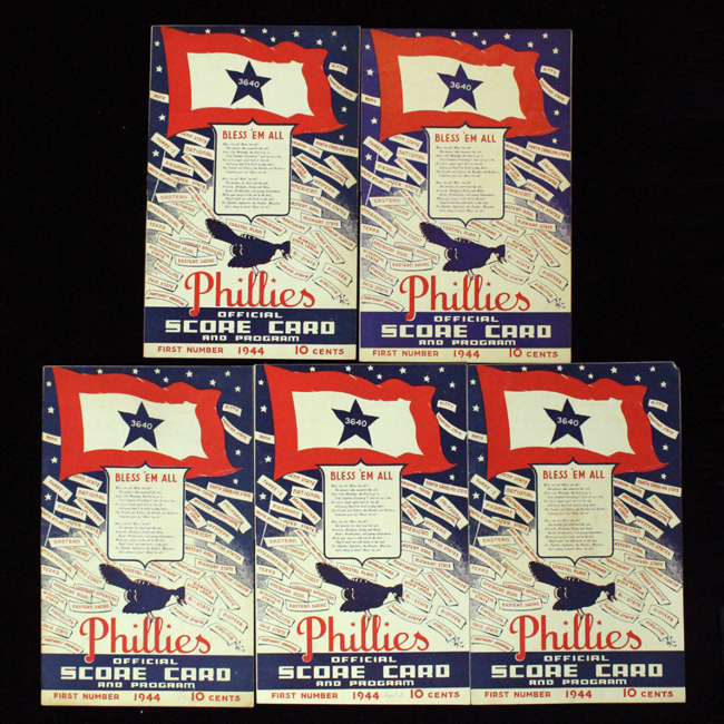 Description:Lot of (5) 1944 Philadelphia Phillies / Blue Jays programs/scorecards, including (1) multi-signed (EX-EX/MT). Includes July 27th Game 2 program from game vs St. Louis Cardinals (EX, scored in pencil); Sept 2nd program from game vs Boston Braves, signed by Moon Mullen, Tony Lupien, Ken Raffensberger, and Harry Shuman in pencil rating 8 to 8/9 out of 10 (EX); (2) Sept 3rd Game 1 programs from game vs Braves (EX-EX/MT, both scored in pencil); and 1944 program from game vs Braves (EX, unscored). Range: EX-EX/MT
