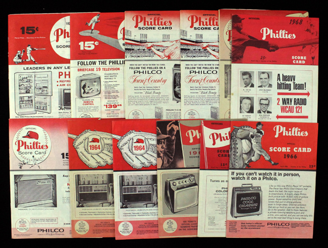 Description:Lot of (12) Philadelphia Phillies programs / scorecards from 1959-1968 (EX-NM). Includes April 22nd 1959 program from game vs Milwaukee Braves (EX, scored in pencil); 1961 program from game vs Cincinnati Reds (EX/MT, unscored); 1962 program from game vs New York Mets (EX-EX/MT, unscored); 1962 program from game vs St. Louis Cardinals (EX/MT, unscored); 1963 program from game vs Reds (EX, unscored); 1963 program from game vs Braves (EX/MT, unscored); 1964 program from game vs Reds (EX-EX/MT, unscored); 1964 program from game vs Braves (EX/MT, unscored); 1965 program from game vs Reds (EX/MT-NM, unscored); 1966 program from game vs Reds (EX-EX/MT, unscored); July 7th 1967 program from game vs Cardinals (EX/MT, scored in pencil, Steve Carlton complete game win); and 1968 program from game vs Cardinals (NM, unscored). Range: EX-NM