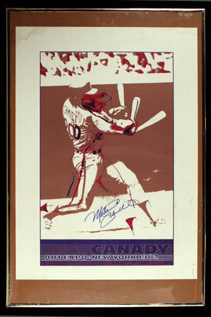 Description:Mike Schmidt signed large format poster (EX-EX/MT). 22"x30.5" 1982 Art Expo poster signed by Schmidt in blue marker. Signature rates 10 out of 10. Housed in 24"x36" frame, so complete condition is unknown, but moisture stains can be seen at the top corners: EX-EX/MT appearance