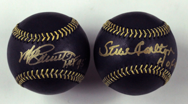 Description:Mike Schmidt and Steve Carlton single-signed and inscribed black leather baseballs (NM). Includes B.Selig ML black leather ball signed by Mike Schmidt in gold marker with "HOF 95" inscription; and B.Selig ML black leather ball signed by Steve Carlton in gold marker with "HOF 94" inscription. Signatures rate 9/10 to 10 out of 10: NM