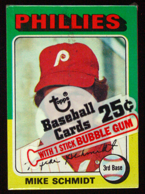 Description:Unopened 1975 Topps cello pack with Mike Schmidt on top (EX/MT). Unopened 18-card cello pack with Mike Schmidt on top and John Mayberry on the bottom. Exhibits minor wear with a slight tear at the top right corner: EX/MT