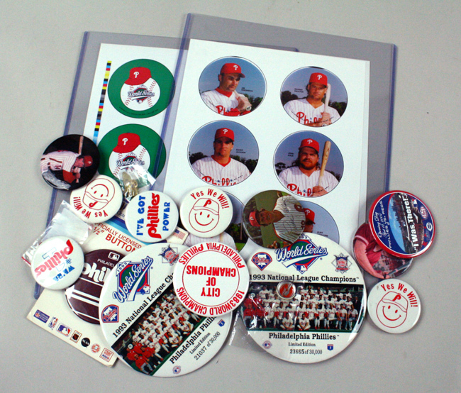 Description:Lot of approx. (125) Philadelphia Phillies pins, medallions, key chains, etc. (EX-MT). Items range from the 1960s-2000s, with most being from the late 1970s through the 1990s. Includes approx. (70) pins, approx. 45 medallions, (9) key chains, proof sheets for 1993 Phillies pins. Most appear to grade EX/MT-NM overall. Range: EX-MT