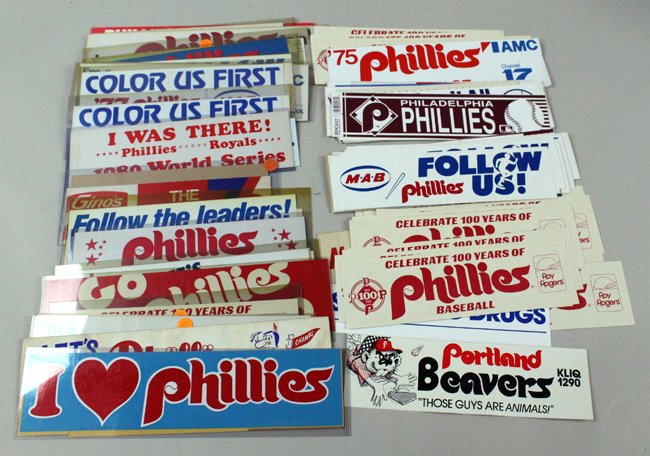 Description:Lot of approx. (110) mostly vintage Philadelphia Phillies bumper stickers, c.1960s-1990s (VG-NM). Most are from the late 1970s through the early 1980s, with some older and some from the 1990s. A few 76ers, Eagles, and others are mixed in. Various conditions throughout the lot. Most appear to grade EX/MT overall. Range: VG-NM