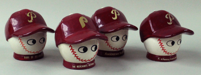 Description:Lot of (4) vintage Philadelphia Phillies banks, c.1960s-70s (VG/EX-EX/MT). Includes c.1960s Phillies bank with "American Bank" decal on the base (EX); c.1960s Phillies bank with "Bank Of Delaware" decal on the base (EX); c.1960s Phillies bank with "First Pennsylvania Bank" decal on the base (VG/EX); and c.1970s Phillies bank with "The Merchants National Bank" decal on the base (EX/MT). Range: VG/EX-EX/MT