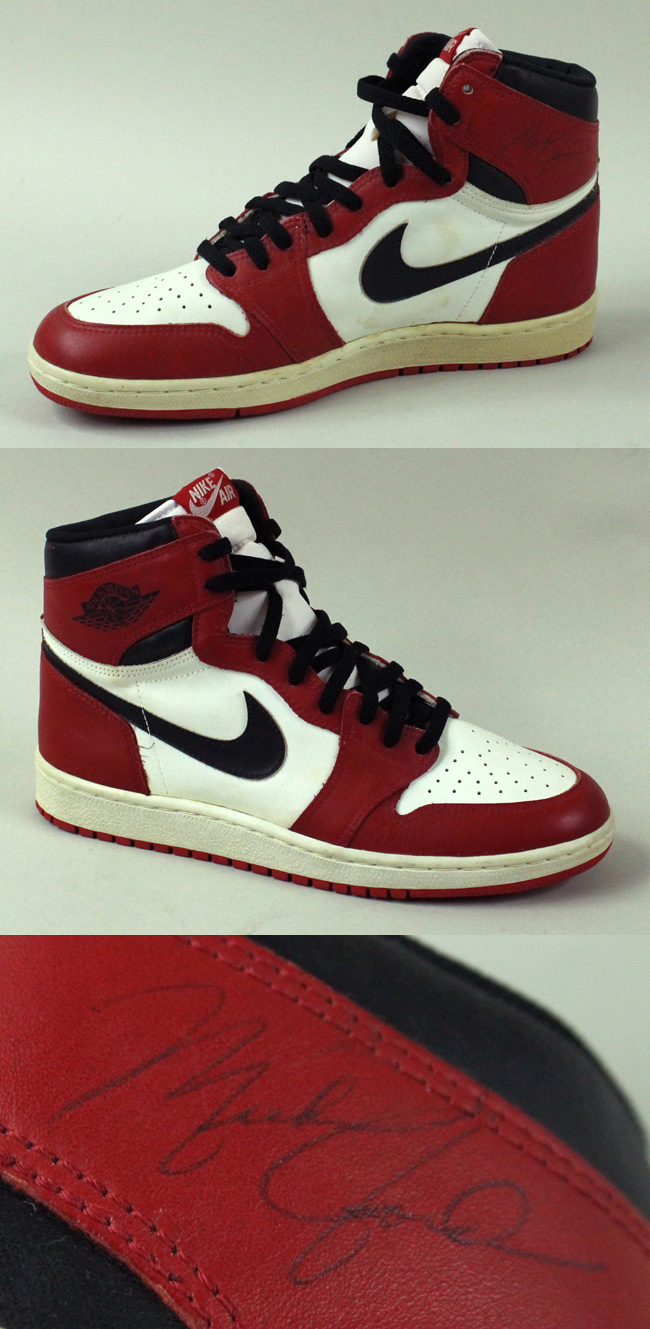 Description:Vintage Michael Jordan signed original Air Jordan 1 sneaker from 1985, JSA (EX/MT). Size 11 right foot Air Jordan 1 sneaker remaining in unworn condition. Jordan signed the left side in black ink. Early career style signature rates 8 out of 10. The sneaker exhibits minimal to no wear with just some minor light brown toning on the left white panel. Includes a full LOA from JSA: EX/MT