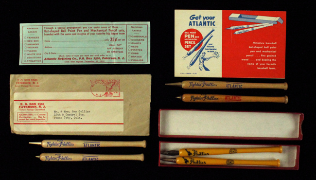 Description:Lot of (3) vintage Philadelphia Phillies pen & pencil sets c.1940s-50s, including Phillies / Blue Jays set (EX/MT-NM). Includes c.1940s Phillies / Blue Jays pen & pencil set (NM); 1951 "Fightin' Phillies" pen & pencil set with original envelope (EX/MT-NM); and c.1950s "Fightin' Phillies" pen & pencil set (EX/MT-NM). Range: EX/MT-NM
