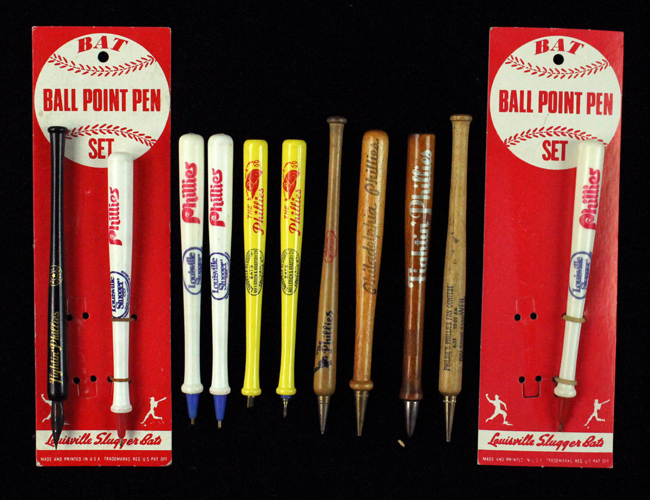 Lot of (11) vintage Philadelphia Phillies pens and pencils, c.1940s-70s (EX-NM). Includes c.1940s Phillies / Blue Jays pencil (EX); (2) c.1950s Phillies pencils (EX/MT-NM); c.1950s Phillies pen (EX/MT); (2) c.1960s Phillies pens (EX-EX/MT); c.1970 Phillies's Phillies Fan Contest pencil (EX/MT); and (4) c.1970s Phillies pens (EX/MT-NM). Range: EX-NM