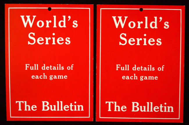 Description:Lot of (2) Philadelphia Bulletin 1950 World Series store display signs (NM). Includes (2) 6"x8" cardboard signs stating: "World's Series" "Full details of each game" "The Bulletin". Both show minor overall wear: NM