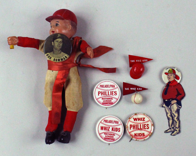 Description:Lot of (7) vintage Philadelphia Phillies pins, c.1950s-60s (VG/EX-NM). Includes 1.75" 1950 Phillies National League Champions pin (EX/MT); 1.75" 1950 Whiz Kids National League Champions pin (EX/MT-NM); 1.75" c.1950s Phillies "Whiz Kids" pin (VG/EX); c.1950s Whiz Kids pennant shaped pin with baseball charm attached (EX); c.1950s Whiz Kids pennant shaped pin with hat charm attached (EX-EX/MT); c.1950s 1.75" Bob Bowman pin (EX, attached to vintage celluloid doll); and c.1960s 1.25" fire department "Phillies' Day" pin (NM, attached to paper fireman). Pins: VG/EX-NM