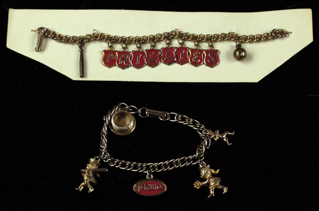 Description:Lot of (2) vintage Philadelphia Phillies charm bracelets, c.1960s-70s (EX/MT-NM). Includes c.1960s Phillies charm bracelet (EX/MT-NM); and c.1970s Phillies charm bracelet with Veterans Stadium and Phil & Phillis charms: EX/MT-NM