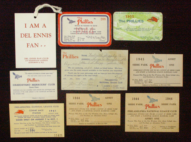 Description:Lot of (9) vintage Philadelphia Phillies and Phillies / Blue Jays passes & related items from 1944-1961 (GD-NM). Includes (3) different 1944 Phillies / Blue Jays passes (EX signed on back by owner, EX/MT, NM); 1945 Phillies / Blue Jays guest pass (NM); c.1940s Phillies / Blue Jays "Grandstand Managers' Club" membership card (VG/EX); 1950 Phillies ticket request receipt (GD, tape repairs); 1955 Phillies pass (G/VG); c.1950s Del Ennis Fan Club paper badge (EX/MT); and 1961 Phillies guest pass (NM). Range: GD-NM