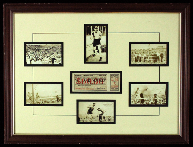 Description:1919 Jack Dempsey vs. Jess Willard unused fight ticket with related postcards in framed display (EX/MT). Visually impressive 20"x26" framed display includes full unused ticket to July 4, 1919 boxing match in which Dempsey defeated Willard. Also includes a series of (6) period real photo postcards with (1) of Dempsey captioned "The New Champion" and the others of the fight in progress. Minor age toning to ticket with normal silvering to postcards: Displays as EX/MT (some edge wear to the frame).