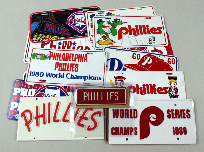 Description:Lot of (18) Philadelphia Phillies license plates, c.1950s-2008 (EX/MT-NM). Includes (3) c.1950s-60s license plates, (3) c.1970s license plates, (2) 1980 World Series Champs license plates, (3) 1984 license plates featuring the Phillie Phanatic, (5) 1990s license plates, 2004 Phillies license plate, and 2008 World Series Champions license plate: EX/MT-NM