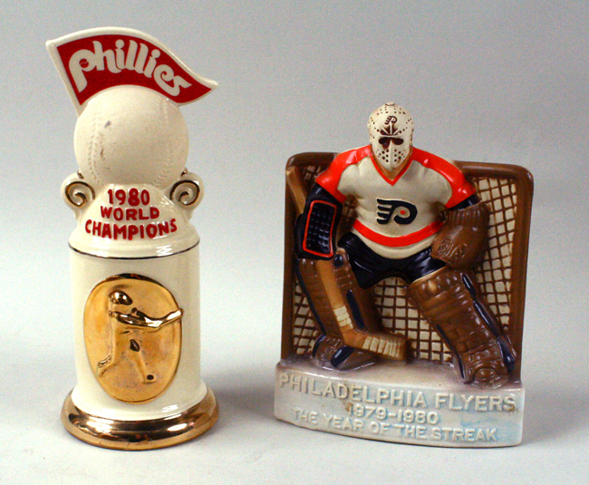 Description:1980 Philadelphia Phillies World Champions decanter & 1980 Philadelphia Flyers decanter (EX/MT). Includes Mount Hope Estate & Winery 1980 Phillies World Champions decanter; and Mount Hope Estate & Winery 1979-80 Philadelphia Flyers "The Year Of The Streak" decanter commemorating their 35-game unbeaten streak. Both show areas of minor surface wear: EX/MT