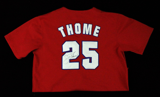 Description:Jim Thome signed Philadelphia Phillies jersey (EX/MT). True Fan size L Phillies #25 Jim Thome jersey signed by Thome in black marker. Signature rates 8 out of 10. Exhibits minor surface wear on the front: EX/MT