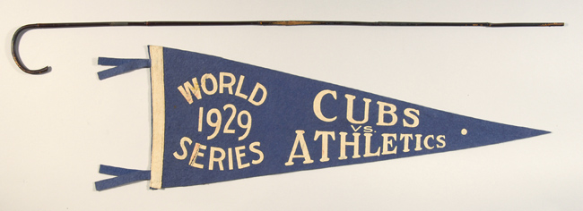 Description:Scarce 1929 World Series pennant with original cane handle. Desirable original 25" long blue felt pennant with applied white lettering dating to the fabled 1929 Philadelphia Athletics Championship season. Light scattered age toning and a hint of fraying at edges with small strip of loss through letter "E" in Series. Retains original cane shaped bamboo handle (cracked and repaired at center). The only example of this possibly unique style that we have encountered: VG/EX-EX