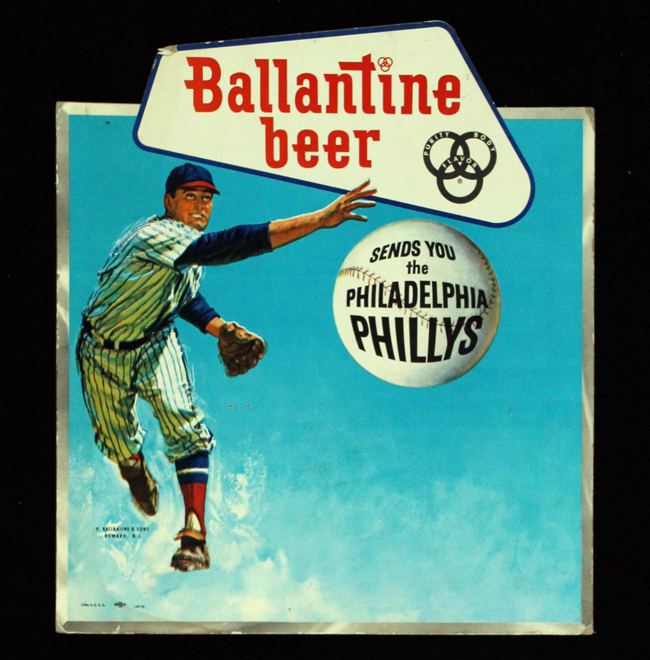 Description:Vintage Philadelphia Phillies "Ballantine Beer" advertising sign, c.1950s (EX). Approx. 14.5"x16.5" cardboard sign stating: "Ballantine Beer Sends You the Philadelphia Phillys". Exhibits moderate edge wear with a moisture stain visible on the back. Fold-out easel is still intact on the back: EX