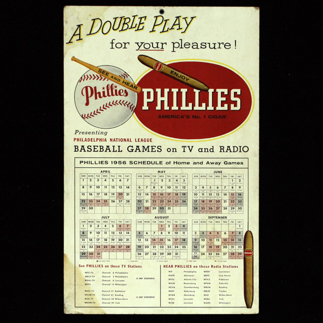 Description:14"x22" 1956 Philadelphia Phillies advertising schedule (EX). Cardboard sign displaying their 1956 schedule, along with advertising for Phillies cigars. Exhibits light corner, edge, and surface wear, with moisture stains visible at the top and bottom left corners: EX