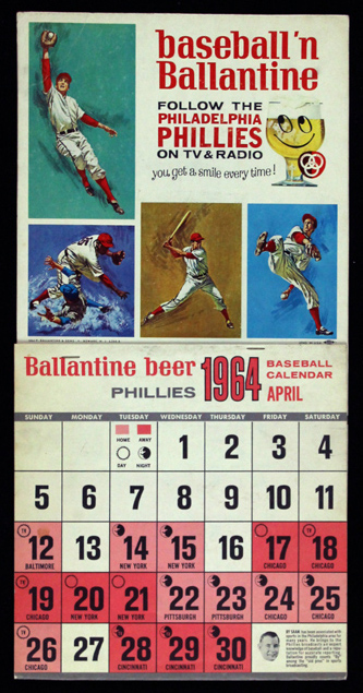 Description:9"x18" Ballantine Beer 1964 Philadelphia Phillies schedule calendar (EX). Features Ballantine Beer advertising at the top, with monthly schedule calendars from April 1964 through March 1965 at the bottom. Exhibits light surface wear with a crease visible at the top left corner. Calendars are still intact: EX