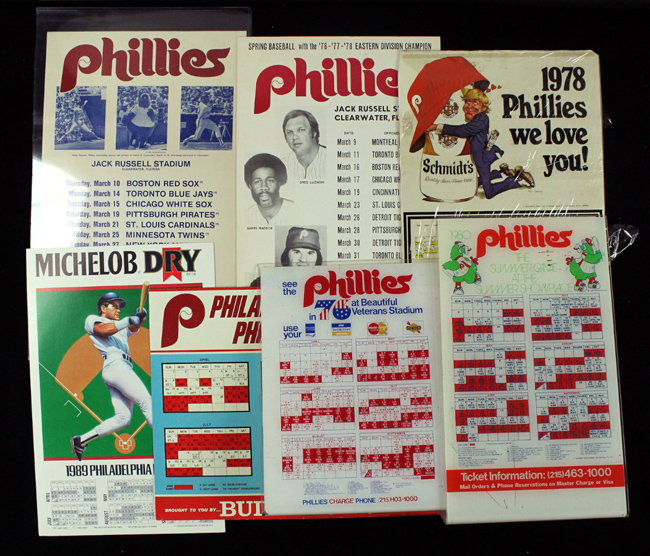 Lot of (7) Philadelphia Phillies large format advertising schedules from 1976-1989 (VG/EX-NM). Includes 12.5"x16.5" 1976 Phillies advertising schedule (EX); 14"x18" 1978 Phillies schedule advertising Schmidt's beer (VG/EX, fold creases); 14"x22" 1979 Phillies Spring Training schedule (EX/MT); 16"x21" 1979 Phillies schedule advertising Budweiser (EX/MT-NM); 12"x20" 1980 Phillies advertising schedule (EX, surface scratches); 14"x22" 1982 Phillies Spring Training schedule (EX); and 13"x20" 1989 Phillies schedule advertising Michelob Dry (NM). Range: VG/EX-NM