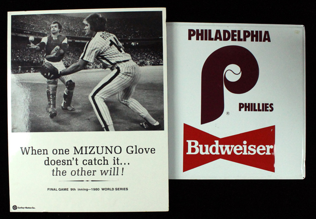 Description:Lot of (15) Philadelphia Phillies large format advertising posters and signs (VG-NM). Includes (2) c.1970s approx. 41"x60" ACME Phillies Night advertising posters; 1976 14"x22" Canada Dry sign featuring Mike Schmidt; c. late 1970s 27"x35.5" advertising sign for autographed baseballs depicting (6) Phillies including Mike Schmidt and Steve Carlton; 1979 11"x16.5" Philadelphia Bulletin poster featuring Pete Rose; 1979 25"x27.5" Burger King sign depicting the Phillies Topps card set; 1979 11.5"x16.5" Burger King sign depicting the Phillies Topps card set; 1980 25"x27.5" Burger King sign depicting the Phillies Topps card set; 1980 11.5"x16.5" Burger King sign depicting the Phillies Topps card set; c.1980 20"x24" "Philadelphia Salutes Pennant-Winning Phillies sign (VG); c.1980-81 22"x28" Mizuno sign featuring Pete Rose and Bob Boone; c.1980s 16.5"x22" Lee jeans sign featuring Mike Schmidt; c.1980s 24"x36.5" ACME Phillies Slugger Contest sign; 1994 9.5"x28" Burger King sign advertising Phillies Photo Balls; and 1994 life size Darren Daulton Milk poster. Various conditions throughout lot. Most appear to grade EX-EX/MT overall. Range: VG-NM