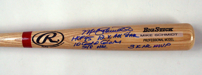 Description:Mike Schmidt signed and multi-inscribed (5 inscriptions) baseball bat (NM). 34" Rawlings Adirondack Big Stick signed by Schmidt in blue marker with "HOF 95" "12X All Star" "10 Gold Gloves" "548 HR" "3X NL MVP" inscriptions. Signature rates 9/10 out of 10. Comes with BC Sports COA (sticker is affixed): NM