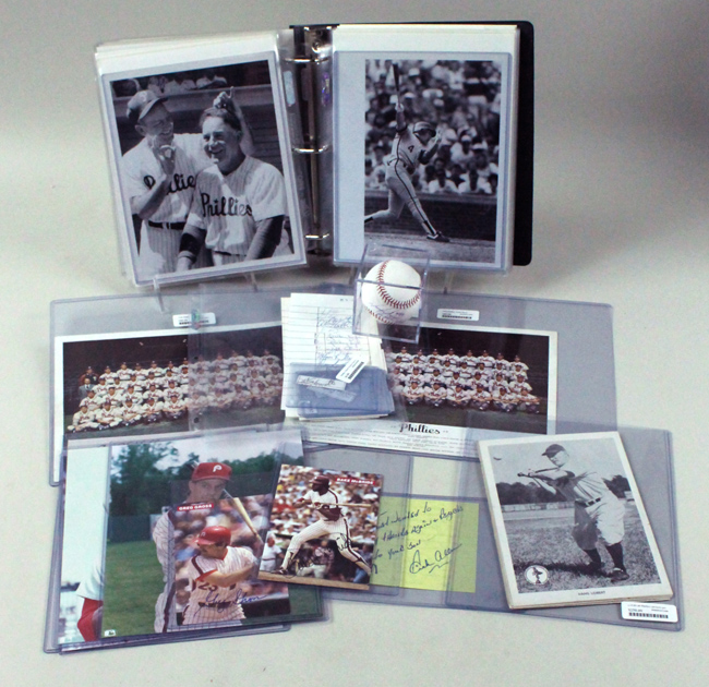 Description:Lot of assorted Philadelphia Phillies memorabilia and autographs (VG-MT). Autographs incl. B.Selig ML ball signed by Tommy Greene w/ "No Hitter 5/23/91" inscription; Questionnaire signed by Peter Sivess; Approx. (375) signatures on cut pages (could be cut-out to use as cut signatures) incl. Mike Schmidt, Steve Carlton, Pete Rose, Tony Perez, Dallas Green, Tug McGraw, Nino Espinosa, Bo Diaz, Garry Maddox, Al Holland, Randy Lerch, Dick Ruthven, Sparky Lyle, Larry Christenson, Marty Bystrom, Bake McBride, Keith Moreland, Dickie Noles, Warren Brusstar, George Vukovich, Larry Bowa, Willie Hernandez, Manny Trillo, Bobby Wine, Ron Reed, Gary Matthews, Tim McCarver, Mike Ryan, Len Matuszek, Terry Mulholland, John Kruk, Mickey Morandini, Jerry Koosman, Juan Samuel, Von Hayes, Larry Andersen, John Denny, Darren Daulton, & others, with duplication of most; and other autographs. Signatures rate 6 to 10 (avg 8/9) out of 10. Also incl. 35" Louisville Slugger 1983 Phillies commemorative bat #ed 162 of 800; (23) c.1939-40 Phillies picture pack photos (VG-EX/MT); (2) 1946 Phillies team photos (VG); and other photos and flats: VG-MT