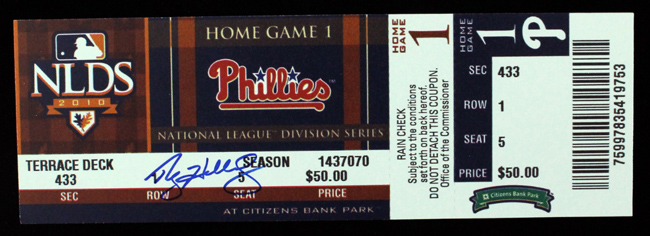 Description:Roy Halladay signed 2010 NLDS No-Hitter mini-mega ticket (NM). 4.5"x14" mini-mega ticket commemorating Halladay's no-hitter in the 2010 NLDS. Halladay signed the "ticket" in blue marker. Signature rates 9/10 out of 10: NM