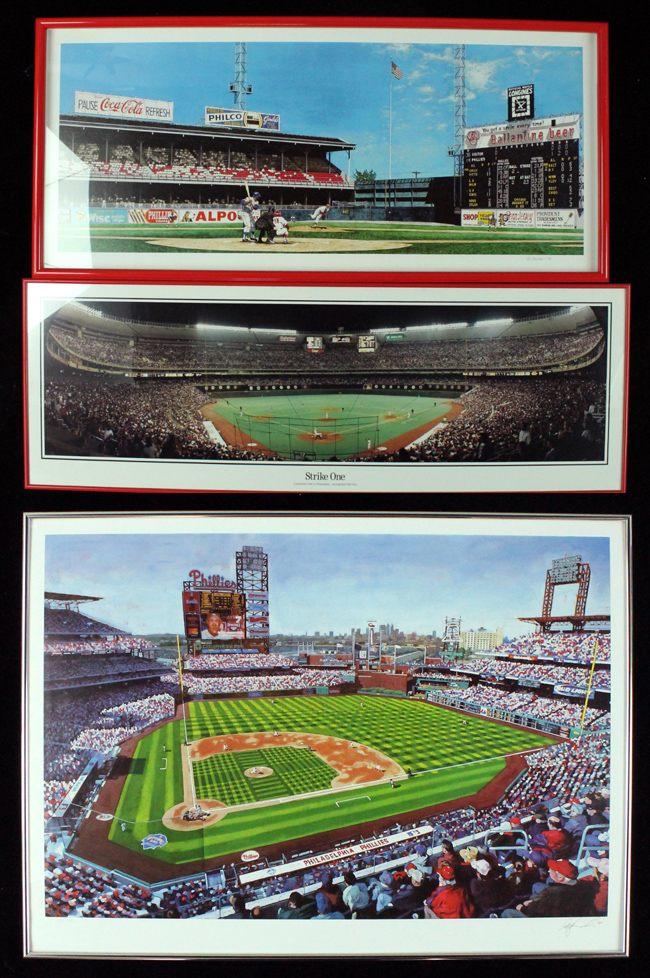 Description:Connie Mack Stadium, Veterans Stadium, and Citizens Bank Park prints (NM). Includes 17"x37" framed print titled "Philly's Perfect Ace" which depicts Jim Bunning pitching in Connie Mack Stadium, signed by artist Bruce Becker in pencil (#ed 210/600); 14"x39" framed print titled "Strike One" which depicts a panoramic view of Veterans Stadium by photographer Rob Arra; and 22"x30" framed print titled "Phillies New Ballpark" which depicts an interior view of Citizens Bank Park, signed by artist Graig Kreindler in pencil (#ed 133/600). Due to framing, complete conditions are unknown: NM appearance
