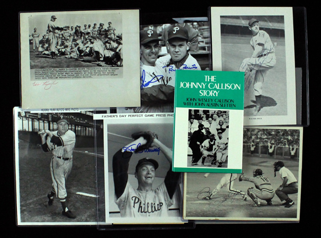 Description:Lot of (9) Philadelphia Phillies single & dual-signed items, including HOFers & deceased (VG-NM). Includes 9"x13" matted display containing index card signed by Gavvy Cravath; 1991 "The Johnny Callison Story" signed by Callison with "Best Wishes" inscription; c.1948-49 UPI press photo signed by Richie Ashburn (personalized); c.1950 AP press photo signed by Eddie Sawyer (VG, moisture stain); 1964 Perfect Game press photo signed by Jim Bunning; 8"x10" photo signed by Pete Rose (VG/EX, pinholes, affixed to backing); 7"x10" photo signed by Walter "Boom Boom" Beck (personalized); 8"x10" photo signed by Dick Allen; and 8"x10" photo signed by both Robin Roberts and Curt Simmons. Signatures rate 8 (Rose) to 10 out of 10: VG-NM