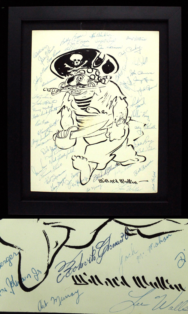 Description:1956 Pittsburgh Pirates team-signed Willard Mullin print with (47) signatures, PSA/DNA (framed, displays as EX/MT). 11"x14" print of the Pirates mascot by Willard Mullin. There are (47) signatures on the print including Roberto Clemente, Danny Murtaugh, ElRoy Face, Bobby Bragan, Bob Friend, Dick Groat, Clyde Sukeforth, Gene Freese, Bob Del Greco, Bob Purkey, Dick Hall, Preston Ward, Nellie King, Toby Atwell, Dale Long, Lee Walls, Ronnie Kline, Dick Littlefield, Joe L. Brown, and others. All are signed in blue ink and rate 8 to 10 out of 10. Print is housed in a 15"x18" frame. Includes a full LOA from PSA/DNA. Exhibits some minor scattered creasing and displays as EX/MT overall.
