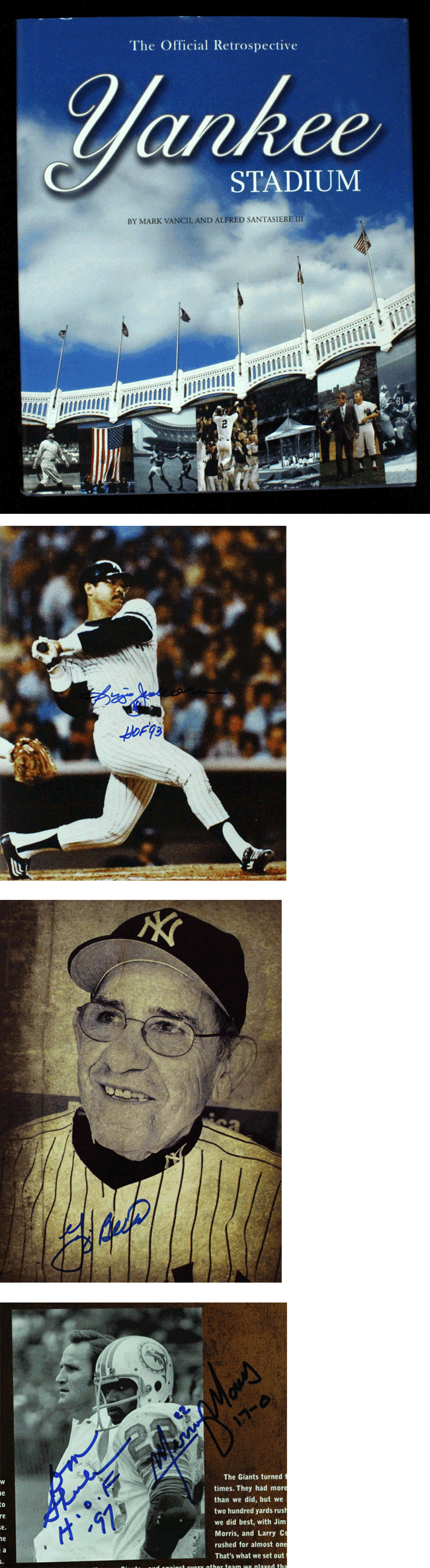 Description:Multi-signed "The Official Retrospective - Yankee Stadium" hardcover book with (37) signatures (NM). An expensive project to duplicate given the dollar figures currently charged for autographs. The book was published in 2008. There are (25) different signers throughout the book with some players signing multiple times for a total of (37) autographs. Signatures include (number of signatures noted in () if more than one): Yogi Berra (3), Raymond Berry, Wade Boggs, Aaron Boone, Chris Chambliss, David Cone (3), Whitey Ford (2), Dwight Gooden, Rich Gossage, Ron Guidry, Sam Huff, Reggie Jackson (2), Al Kaline, Don Larsen (2), Jim Leyritz, Tino Martinez, Don Mattingly (3), Mercury Morris, Paul O'Neill, Cal Ripken Jr., Don Shula, Mel Stottlemyre (2), Darryl Strawberry, David Wells, and Dave Winfield. Some players added inscriptions. All are signed in ink or marker and rate 9 to 10 out of 10 on average.: NM