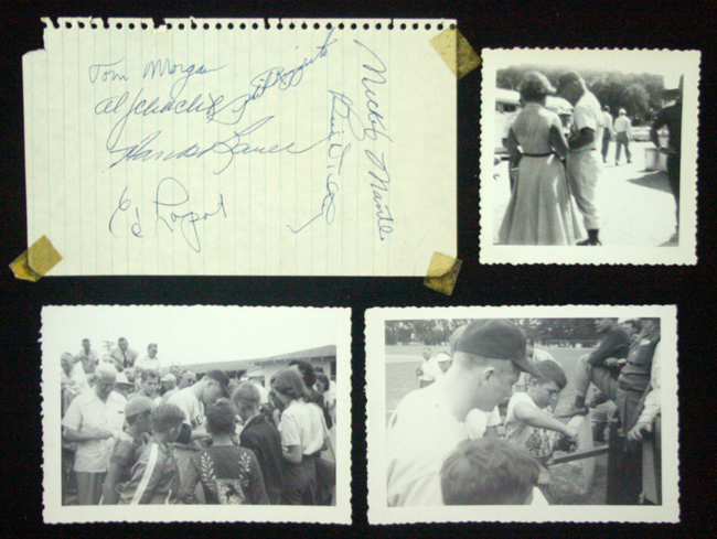 Description:Vintage Mickey Mantle and other New York Yankees multi-signed 4"x7" sheet with candid photos of Mantle signing c.1952 (EX-NM). A lined sheet of notebook paper signed by (7) including Mickey Mantle, Bill Dickey, Tom Morgan, Phil Rizzuto, Hank Bauer, Ed Lopat, and Al Schacht. All were signed c.1952 in blue ink rating 9 to 10 out of 10. Includes (2) original 3.5"x5" candid b&w photos of Mantle signing autographs in 1952, and a 3.5"x3.5" candid b&w photo of an unidentified Yankees player signing autographs in 1955. The signed sheet has pieces of vintage clear tape at the corners: EX-NM