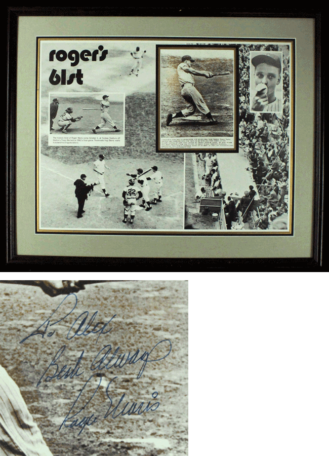 Description:Roger Maris signed 25.5"x31" 61st Home Run framed display (EX/MT). B&w display featuring various images from Roger Maris' 61st home run. Maris signed an inset 7.5"x9.5" later print of a press photo in blue ink. Maris personalized it "To Alex, Best Always". Signature rates 8/9 out of 10. The frame is missing its glass. Displays as EX/MT