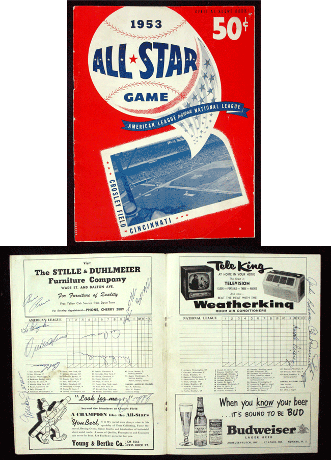 Description:Multi-signed 1953 Baseball All-Star Game program with (14) signatures including Mantle, Robinson, and Rickey (VG/EX). Original program from Crosley Field signed by (13) on the inner scorecard pages. Signers include Mickey Mantle, Jackie Robinson, Branch Rickey, Carl Furillo, Chuck Dressen, Duke Snider, Ted Kluszewski, Al Rosen, Eddie Robinson, Bob Lemon, Mickey Vernon, Orteses Minoso, and Bill Pierce. There is also a George Myatt signature on the back cover. All are signed in blue ink and rate 8 to 9 out of 10. Program exhibits typical handling wear: VG/EX