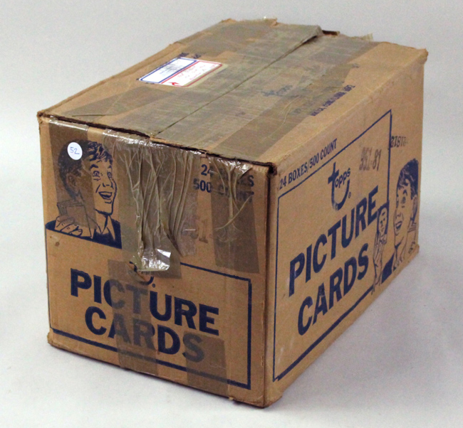 Description:1981 Topps Baseball unsearched vending case (EX/MT-MT). A full unsearched vending case containing (12,000) 1981 Topps Baseball cards. The top of the case is opened, but all of the interior vending boxes show little to no handling wear and are unsearched. Case exhibits typical handling wear with tape affixed to the top and bottom. Card are presumably in NM-MT condition.