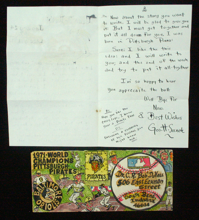 Description:George Sosnak hand-drawn/painted 1971 Pittsburgh Pirates World Champions themed envelope with hand-written and signed letter (EX). 4"x9" envelope featuring a multi-color hand-drawn/painted 1971 World Champions Pittsburgh Pirates scene on the addressed front by George Sosnak. Includes original hand-written letter from Sosnak dated January 24, 1972. Sosnak signed the letter in black ink and also wrote his name and address on the back of the envelope: EX