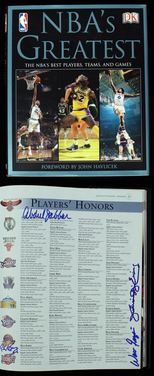 Description:Multi-signed "NBA's Greatest - The NBA's Best Players, Teams, and Games" hardcover book with (30) signatures (NM). An expensive project to duplicate given the dollar figures currently charged for autographs. The book was published in 2003. There are (11) different signers throughout the book with most players signing multiple times for a total of (30) autographs. Signers include (number of signatures noted in () if more than one): Red Auerbach (5), Rick Barry (2), Julius Erving (3), Walt Frazier (3), Elvin Hayes (2), Abdul-Jabbar (4), Sam Jones (2), Willis Reed (4), Dennis Rodman (2), David Thompson, and Wes Unseld. Some players added HOF inscriptions. All are signed in marker and rate 9 to 10 out of 10 on average.: NM