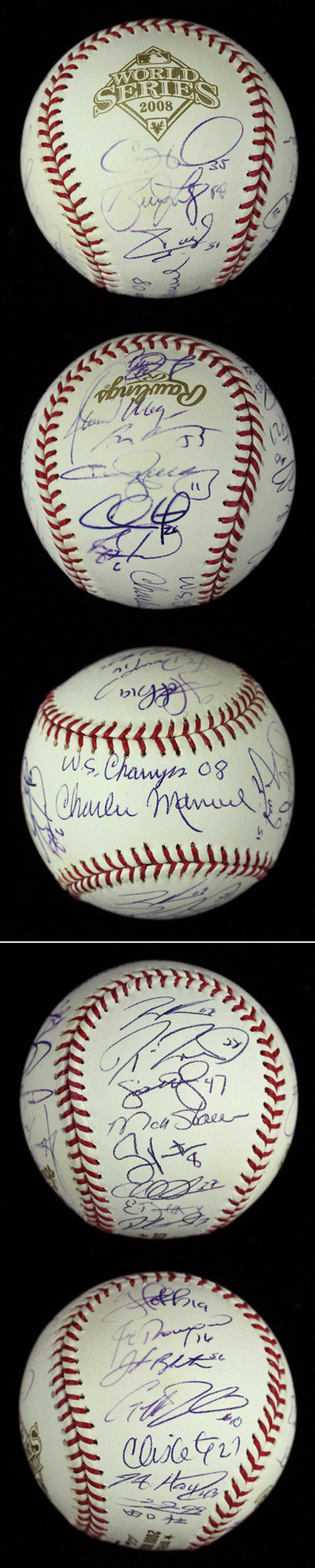 Description:2008 Philadelphia Phillies World Champions team-signed baseball (NM). There are (25) signatures on the ball including Ryan Howard, Chase Utley, Jimmy Rollins, Carlos Ruiz, Cole Hamels, So Taguchi, Charlie Manuel with "W.S. Champs 08" inscription (on sweet spot), Shane Victorino, Jayson Werth, Pedro Feliz, Brett Myers, Greg Dobbs, J.C. Romero, Joe Blanton, Geoff Jenkins, Chris Coste, J.A. Happ, Ryan Madson, Scott Eyre, Matt Stairs, Chad Durbin, Eric Bruntlett, Jamie Moyer, Clay Condrey, and Brad Lidge. All are signed in blue ink and rate 7 to 9 out of 10 with some being slightly faded. Ball exhibits no wear with just a light trace of toning: NM