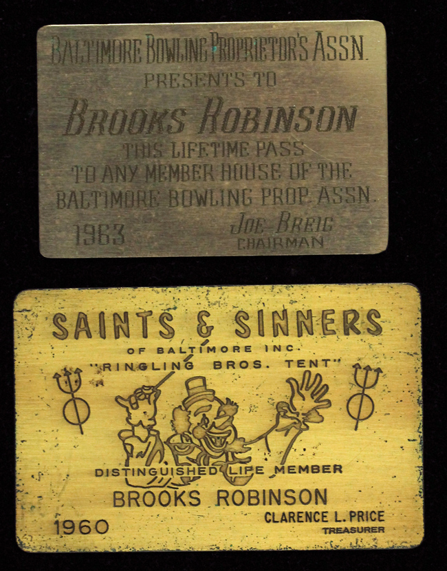 Description:Lot of (2) Brooks Robinson personal lifetime membership passes (EX). Includes: 2 1/4"x3 1/2" "Saints & Sinners of Baltimore Inc. "Ringling Bros. Tent" Distinguished Life Member" metal pass dated 1960; and a 2"x3" metal pass which reads "Baltimore Bowling Proprietor's Assn. Presents To Brooks Robinson This Lifetime Pass to Any Member House of the Baltimore Bowling Prop. Assn. 1963". Passes exhibit light surface wear and some age spotting: EX