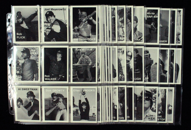 Description:Scarce 1975 Topps Mike Mandel "Baseball - Photographer Trading Cards" (134)-card set (NM-NM/MT overall). An obscure set authored and published by photographer Mike Mandel in 1975. The set features important and influential photographers, curators, art historians and critics posing with baseball equipment as if they were actual baseball players. The cards were originally packaged and sold in groups of 10 with sticks of chewing gum by Topps. Only 3,000 sets were produced. Missing only the checklist. Set grades NM-NM/MT overall.