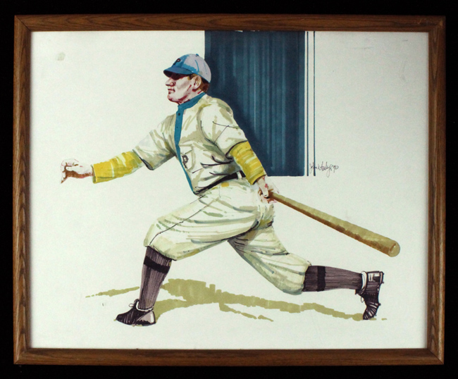 Description:Large 24"x30" original watercolor painting of Honus Wagner (framed, EX/MT). Painting depicts Wagner in Pittsburgh Pirates uniform in his batting follow through pose. The artist (appears to be John W. Hurley) signed the painting and dated it 1990. Housed in a frame: EX/MT