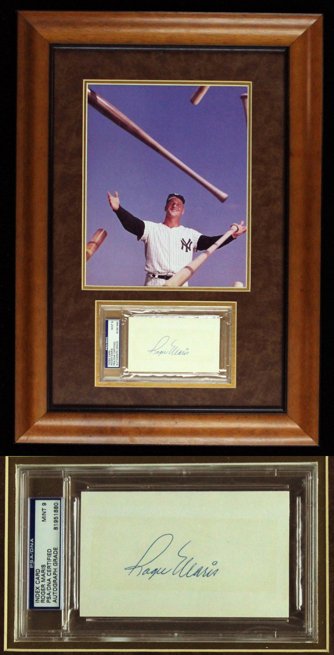 Description:Roger Maris signed 3"x5" index card in framed photo display, PSA/DNA (NM). 17"x24" framed display featuring a Roger Maris signed 3"x5" index card. Blue ink signature is authenticated, encapsulated, and graded Mint 9 by PSA/DNA. Matted above the signature is an unsigned 8"x10" color photo of Maris: NM