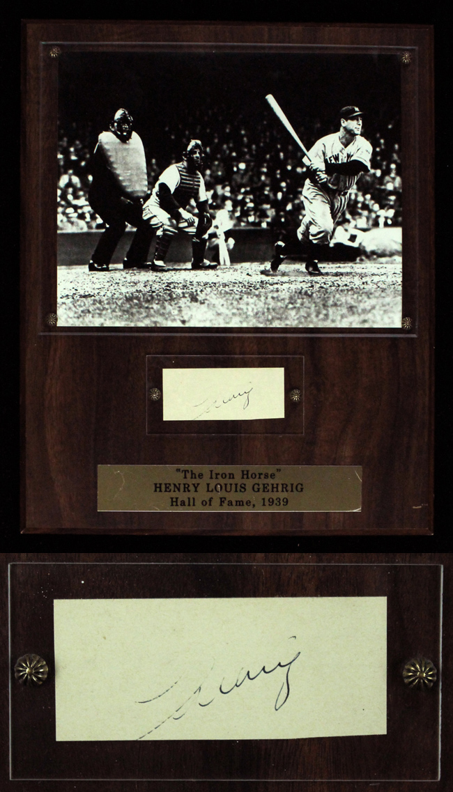 Description:Lou Gehrig cut signature display, JSA (EX/MT). 12"x15" wooden plaque featuring a 1 1/2"x3 1/2" cut signed Lou Gehrig in black ink. The signature rates 5 out of 10 due to the beginning of the signature being light. Displayed above the cut signature is a modern printed 8"x10" b&w photo of Gehrig. Includes a full LOA from JSA: EX/MT