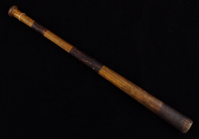 Description:Vintage ring style folk art baseball bat c.1880s-90s (VG-VG/EX). 34.5" long hand made bat with three rings painted on it. Exhibits moderate surface wear including scattered paint marks, paint loss, scratches, etc. Displays well overall: VG-VG/EX