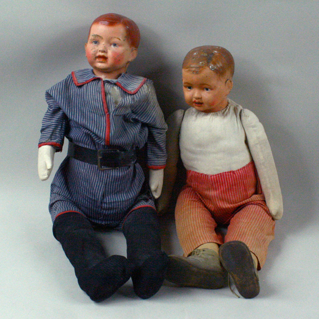 Description:Lot of (2) vintage Elektra baseball player composition dolls c.1900s (VG overall). One measures 33" long and is dressed in a blue and white pinstriped uniform with belt and socks (missing shoes, hats, and any other original accessories that are not noted as being included). The uniform exhibits scattered tears mainly on the left side. Also includes one that measures 30" long with red and white pinstriped pants (retains original shoes, but is missing all other accessories and clothing). Both dolls are marked "Elektra" on the back of the neck. both exhibit moderate handling wear with some surface/paint loss to the heads/faces: VG overall