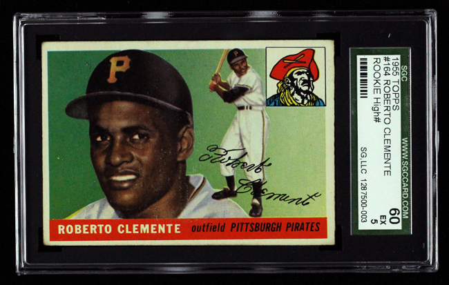 Description:1955 Topps #164 Roberto Clemente rookie card (SGC 60 EX). Nicely centered example featuring good color and focus with clean front and back. Exhibits light corner wear. Graded SGC 60: EX